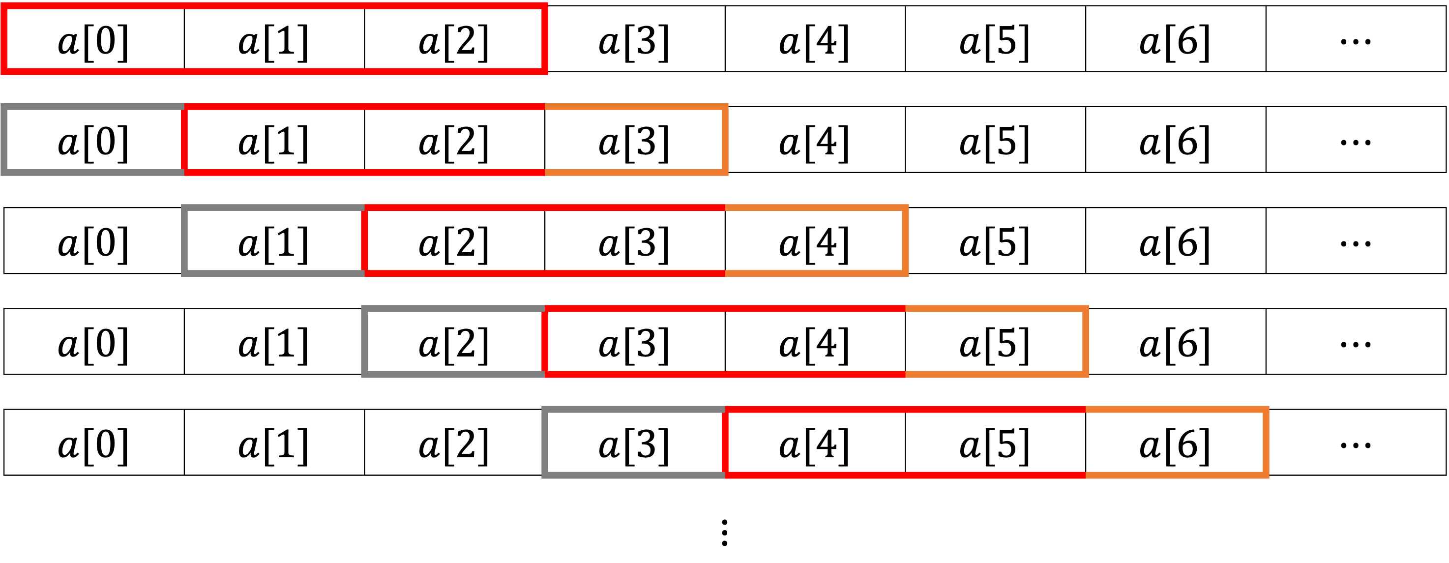 (윈도우의 크기를 고정시키지 않는 경우도 있는데, 이는 투 포인터 알고리즘이라고 부른다.)