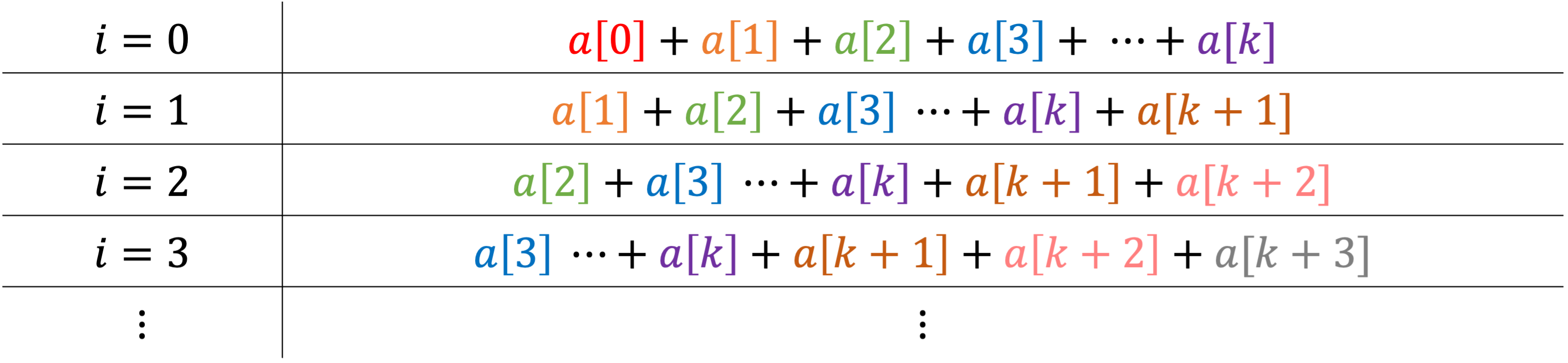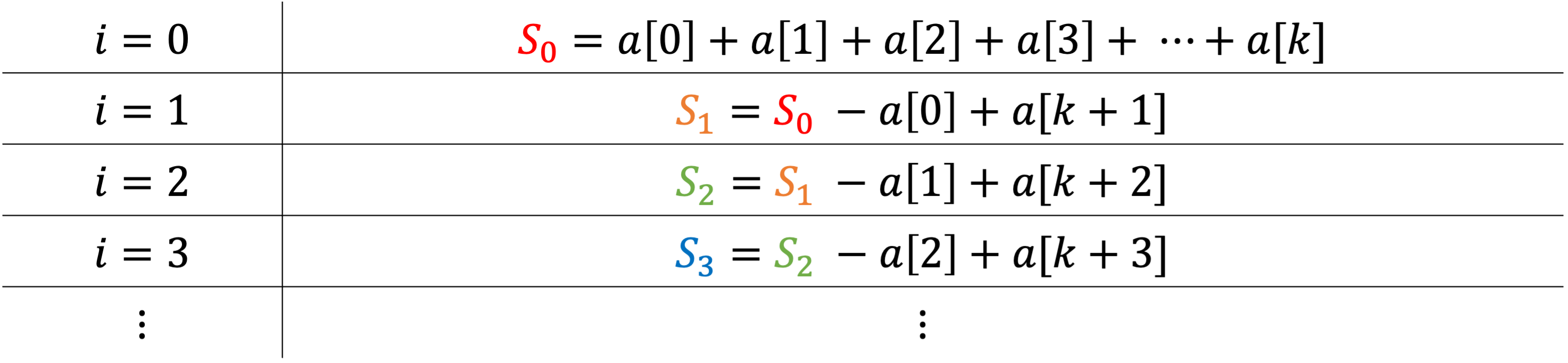 $i$가 증가할 때마다 모든 값을 계산하는 것이 아니라 앞선 결과에서 사라지는 원소를 빼고 추가되는 원소만 더해주는 방식이다.
