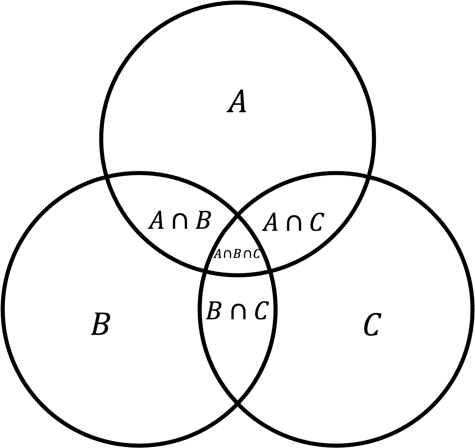 따라서 $ - | A \cap B | - | B \cap C | - | A \cap C | $를 해주어야 하는데, 이렇게 되면 $ | A \cap B \cap C | $가 중복으로 빼진다.