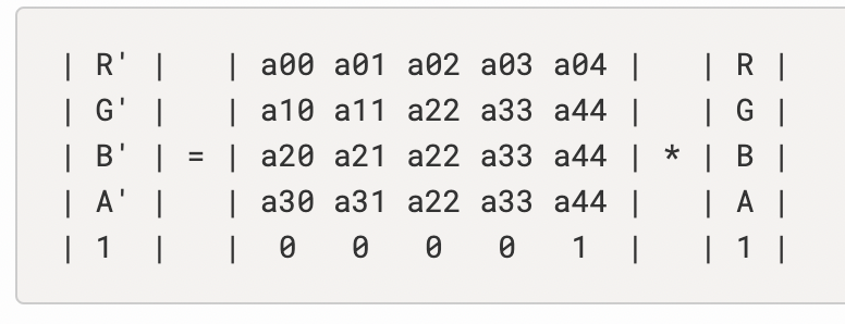 이렇게 되면 원래의 색상 (R, G, B, A)가 위의 식을 통해 새로운 색상값 (R', G', B', A')값이 도출되게 된다.