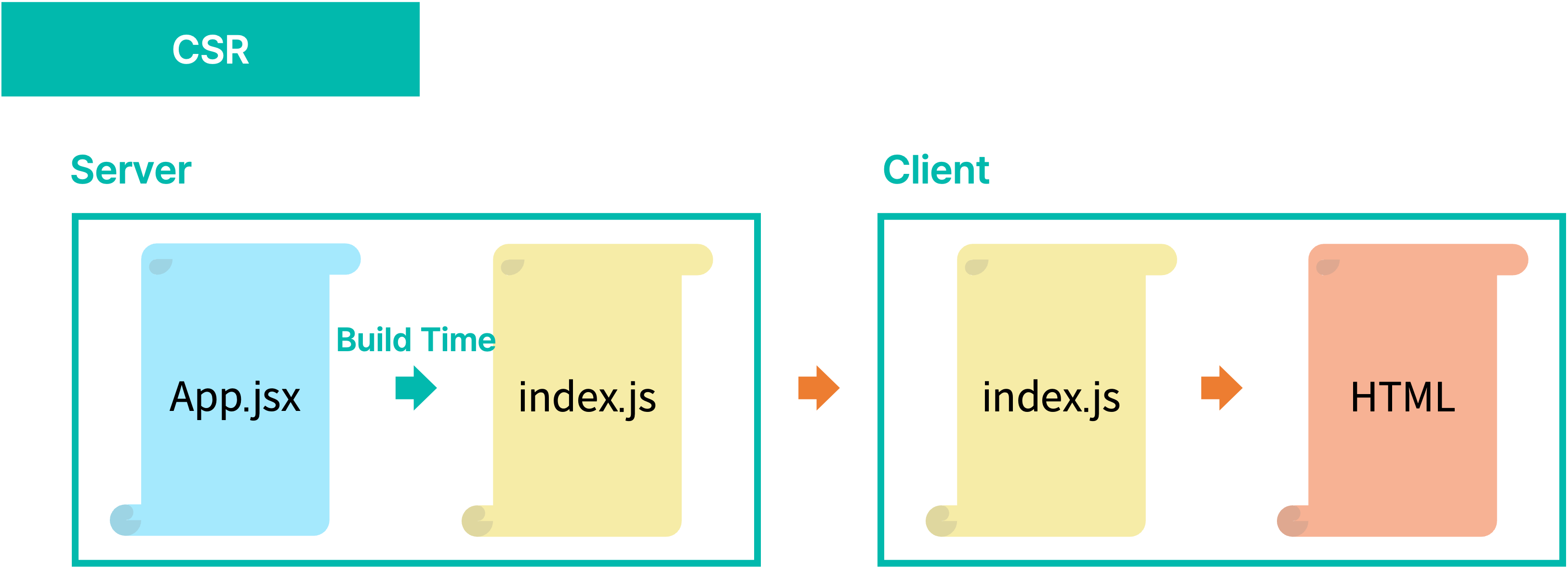 CSR은 Build Time에 만들어진 js 파일을 클라이언트에서 불러와 직접 실행시킴으로써 렌더링을 진행한다.